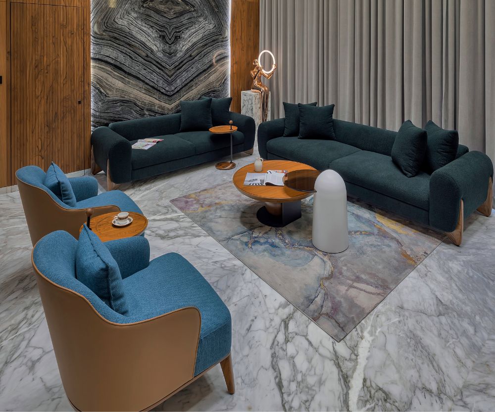 Mr. Krunal Thakkar has a stunning penthouse in Adajan, Surat. He envisioned some luxurious and bespoke living room furniture and showed us what they wanted to create for their home. Their inspiration photos had some unique Italian designs for the sofa set, centre table, designer chairs, C-shaped coffee table, and dining table. They had a vision, and we took the responsibility to turn it into a beautiful reality by creating tailor-made furniture. We customized the color of the fabric used in the sofa so it blends in with the living room's aesthetics.